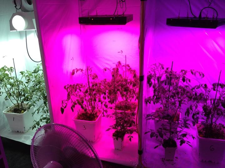 On 10 June 2012, approximately 20 Lake Valley Seed brand Super Sweet 100 Tomato seeds were sealed in a Ziploc bag with a damp paper towel and left to germinate. On 17 June, the germinated seeds were distributed equally among nine 5-inch plastic pots in a mixture of Roots Organic 707 soil and Mycos and watered with tap water at 40ppm. The pots were each assigned a number (1–9) and placed in groups of three in each of three adjacent, three-sided booths. Each booth measured approximately 93.0 cm x 89.5 cm x 225.0 cm, and was completely lined with black 6 millimeter and white poly "Panda Tarp" with the white side facing inward to maximize reflectance. Each booth was set up with an individual light source: Booth 1 (pots 1, 2, 3) contained a 400-watt Hortilux MH bulb in a Hydrofarm Daystar hood with a Nextgen 600w/400w Digital ballast (HID). Booth 2 (pots 4, 5, 6) contained a 420-watt Black Dog LED Flower Spectrum panel (BD450F). Booth 3 (pots 7, 8, 9) contained a 270-watt Black Dog LED Vegetative Spectrum prototype panel (270W). On 28 June, the seedling plants were thinned out to leave nine plants of the most similar heights, with one in each pot.