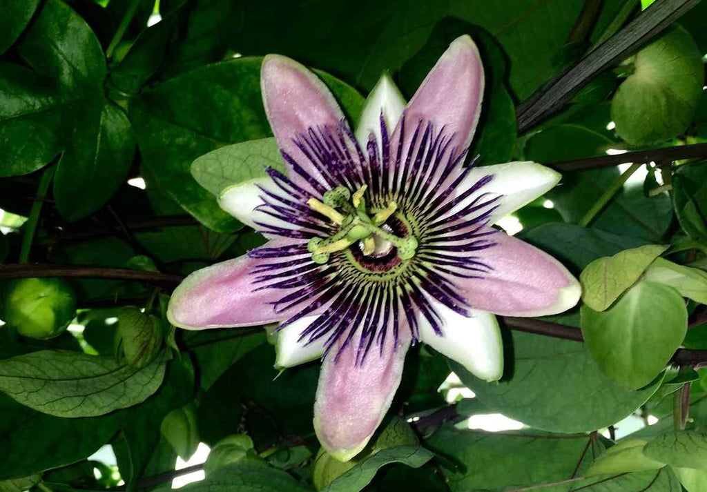 This hybrid passionflower demonstrates the beautiful flower complexity common to the Passiflora genus, with a pleasant perfume as well.